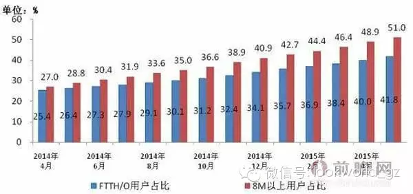 2014-2015年5月光纤接入FTTH/O和8M及以上宽带用户占比情况,互联网宽带接入用户数达2.06亿户,8Mbps及以上宽带用户占比过半。1-5月,三家基础电信企业互联网宽带接入用户净增502万户,总数达到2.06亿户。宽带城市建设继续推动光纤接入的普及,光纤接入FTTH/0用户比上年末净增1764.9万户,比上年同期净增数高57.7%,总数达到8596.5万户,占宽带用户总数的比重达到41.8% 。“宽带中国”战略的加速推进,宽带提速效果日益显著, 8Mbps及以上接入速率的宽带用户总数占宽带用户总数的比重达到51.0%;20Mbps及以上宽带用户总数占宽带用户总数的比重达17.3%,比上年末增加6.9个百分点。
